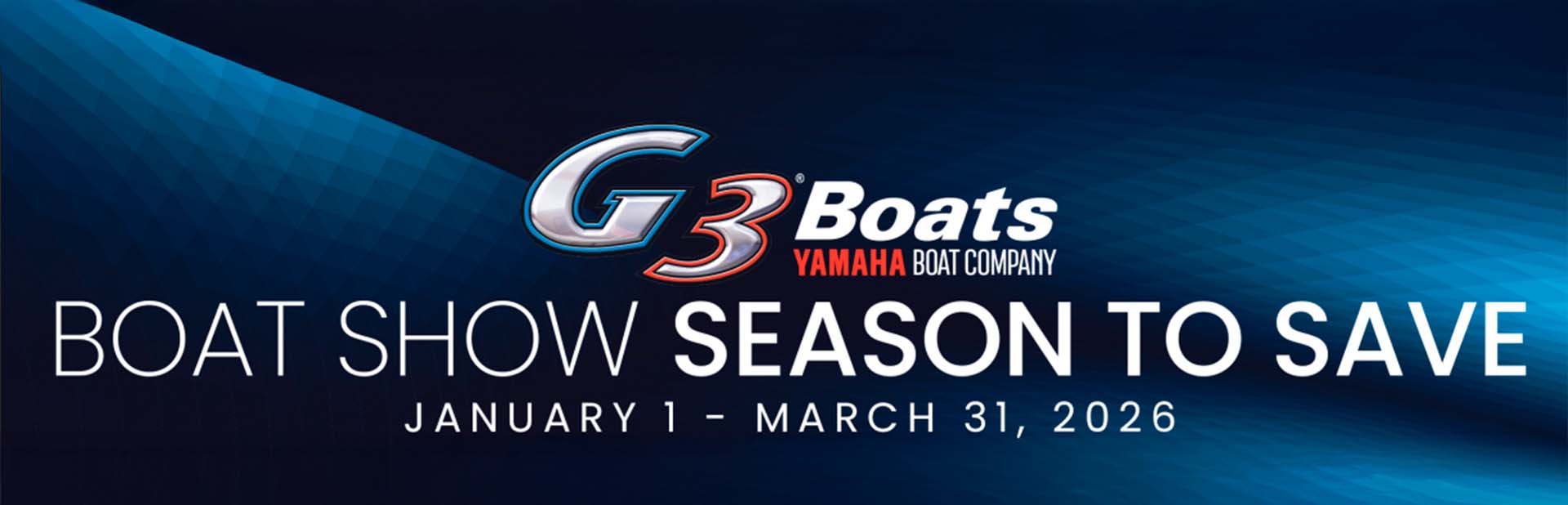 Terms and Conditions: For Customer Benefit Option 1, all Instant Rebates are offered and provided to purchasing customer, residing in the USA, at the time of sale and are deducted from final sale price. All eligible Instant Rebates will be credited to dealer’s parts account and not provided directly to the customer from G3. Rebates eligible in the USA. All Eligible Product, sold, warranty registered, and delivered to customer - between 1/01/2026 and 03/31/2026 will be eligible for “Boat Show Season to Save” Customer Benefit Options. No exceptions. Warranty registrations must be submitted on-line using the G3 Dealer System no later than March 31, 2026. Once reviewed and approved for Customer Benefit Option 1, G3 will credit your parts account with the Instant Rebate. Instant Rebate will not be processed until Eligible Product is warranty registered by deadline and final verification that Eligible Product has met all Promotion terms, conditions, and procedures. All Promotion benefits must be provided to purchasing customer at no additional cost. G3 reserves the right to request any documents for transaction submitted for Promotion consideration. Dealer is responsible for any additional benefits and/or cost of items they choose to offer customer that are not covered in Promotion benefits. No model substitutions, benefit substitutions, rain checks, or extensions will be allowed. Not redeemable for cash. This offer is not transferable. Eligible Product sold or provided for commercial, camp, resort, rental, promotional/demo, government agency, competition, tournament, or sponsorship use are not eligible. G3 reserves the right to change or cancel this Promotion at any time. Dealer must not warranty register any Eligible Product until a true sale is completed and Eligible Product is delivered to purchasing customer. Any Eligible Product registered by dealer to a fictitious name or for a sale that did not truly transpire will be grounds for fraud investigation. Promotion benefit will be issued after eligibility has been verified to comply with Promotion terms, conditions, and procedures.